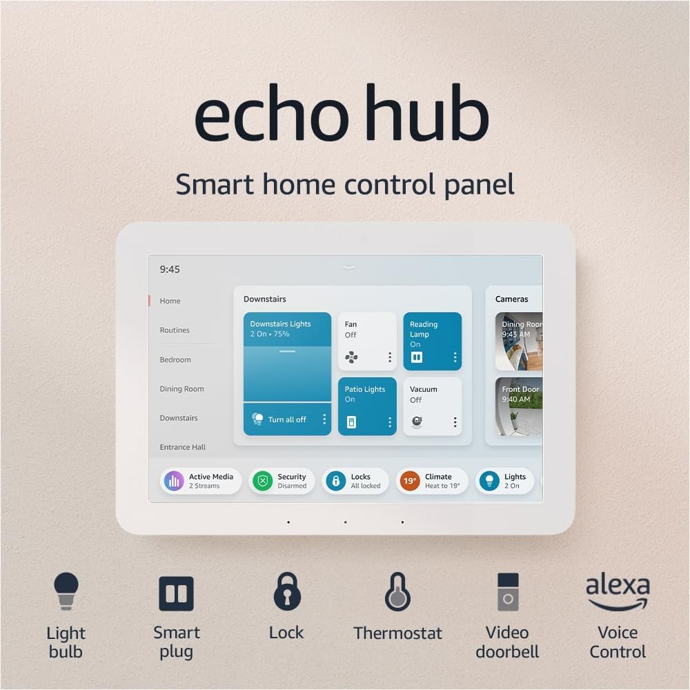 | Included in the box | Echo Hub, power adaptor (12.5 W) and 1.8 m cord (white), wall mount, wall plugs, screws, mounting template and quick-start guide. Setup requires internet via Wi-Fi or Ethernet. Device can be wall mounted (electric drill required) or placed on a stand (sold separately). Device not intended for handheld or portable use. |